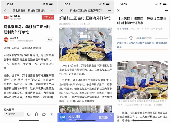 近日,人民網(wǎng)河北頻道、河北日報客戶端、今日頭條等各大媒體先后刊登了題為《河北秦皇島:鮮桃加工正當時 趕制海外訂單忙》的新聞,對秦皇島富滋公司鮮桃加工業(yè)務進行了宣傳報道。