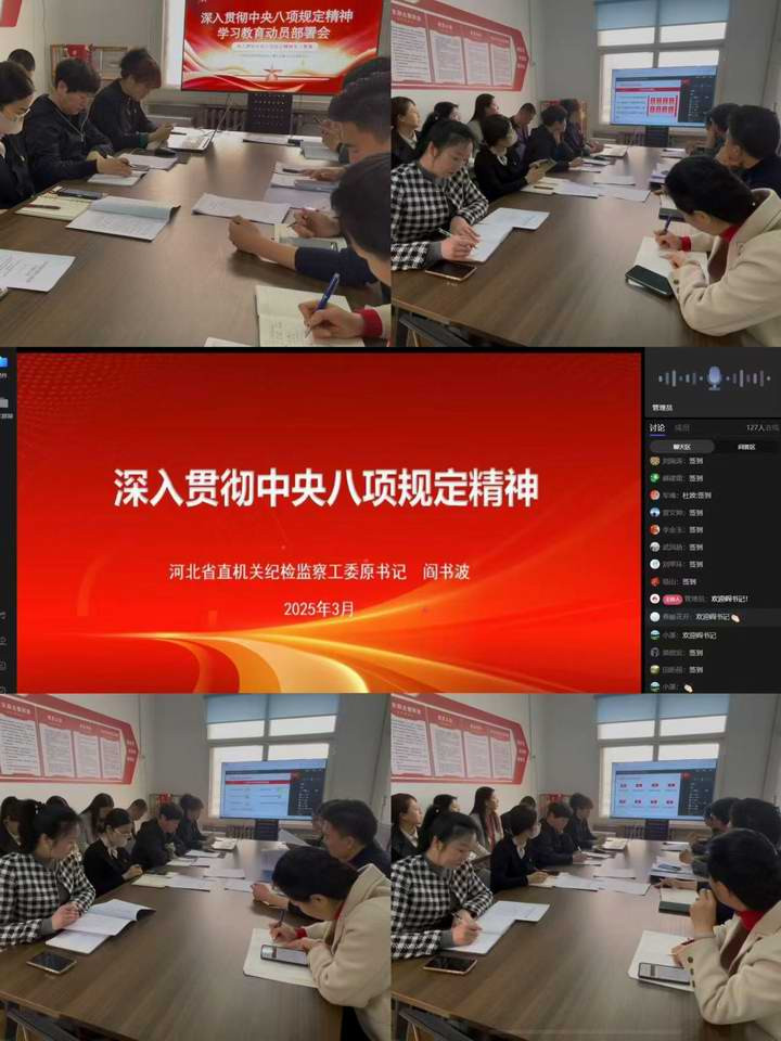 會(huì)議認(rèn)真落實(shí)上級(jí)部署要求,深入學(xué)習(xí)習(xí)近平總書記關(guān)于深入貫徹中央八項(xiàng)規(guī)定精神學(xué)習(xí)教育的重要講話和重要指示精神,傳達(dá)學(xué)習(xí)《中共中央辦公廳關(guān)于在全黨開(kāi)展深入貫徹中央八項(xiàng)規(guī)定精神學(xué)習(xí)教育的通知》和中央八項(xiàng)規(guī)定及其實(shí)施細(xì)則精神,集體觀看了河北省直機(jī)關(guān)紀(jì)檢監(jiān)察工委原書記閆書波《深入貫徹中央八項(xiàng)規(guī)定精神》的直播課,安排部署河北世貿(mào)通學(xué)習(xí)教育工作。